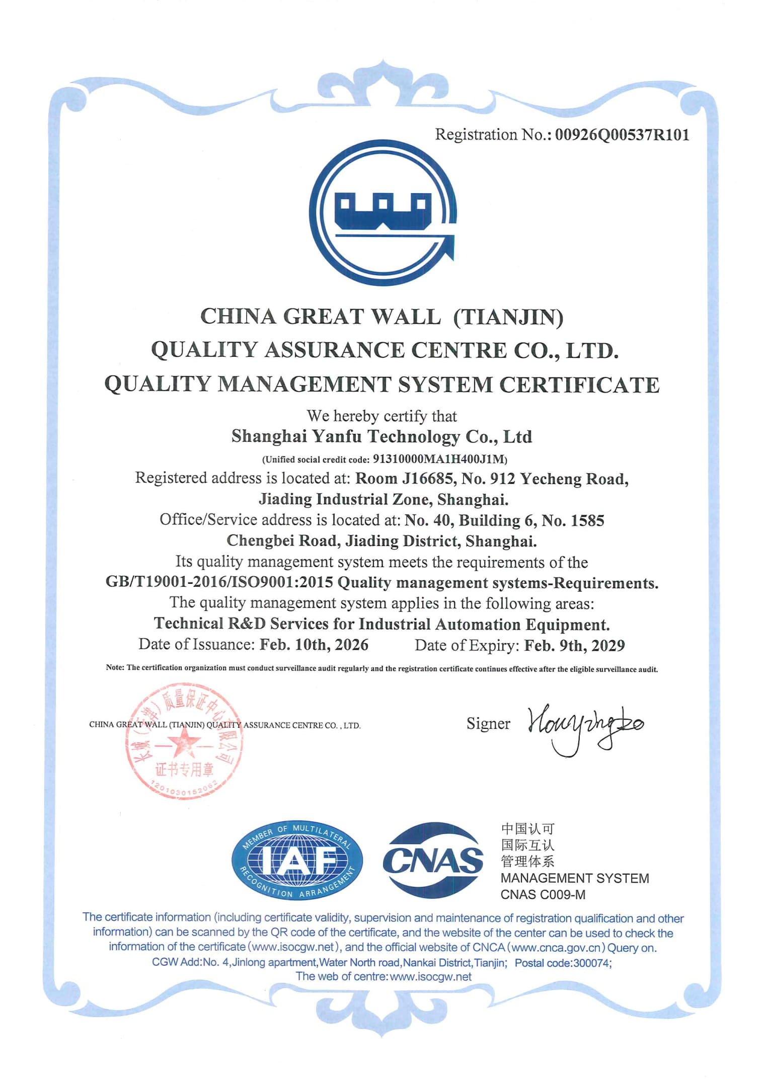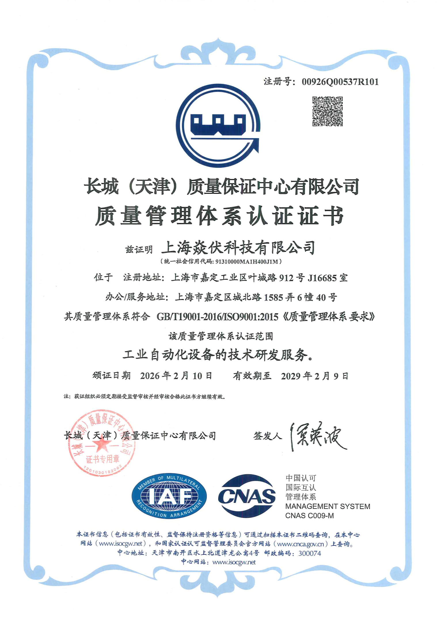 通过GB/T19001-2016/ISO9001:2015 质量管理体系认证